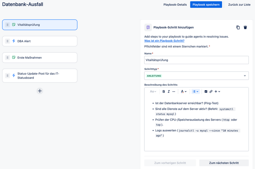 Szenario: Ein Unternehmen nutzt eine zentrale SQL-Datenbank für seine Geschäftsanwendungen. Plötzlich melden mehrere Abteilungen, dass Anwendungen nicht mehr erreichbar sind. Ein Incident wird im Jira Service Management erfasst und das "Datenbank-Ausfall"-Playbook zur Abarbeitung genutzt: